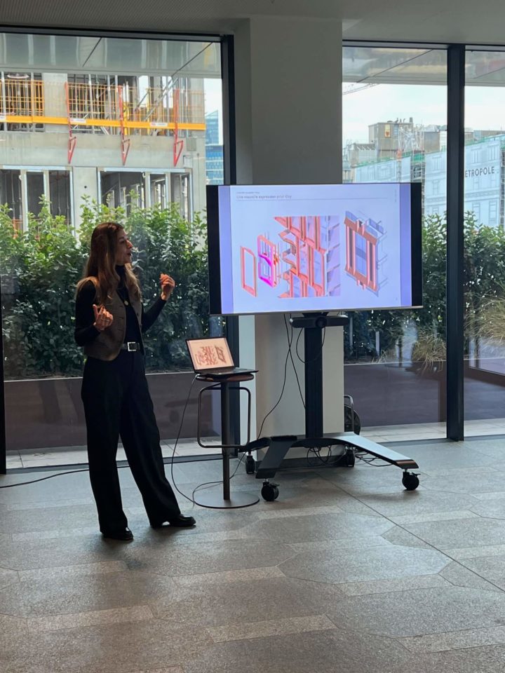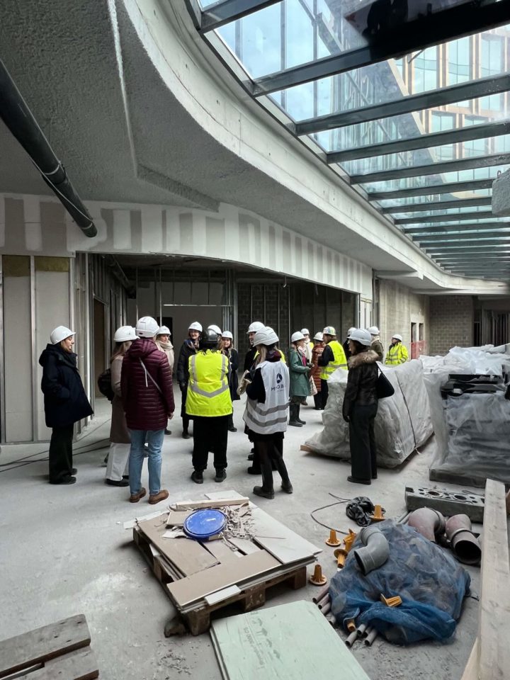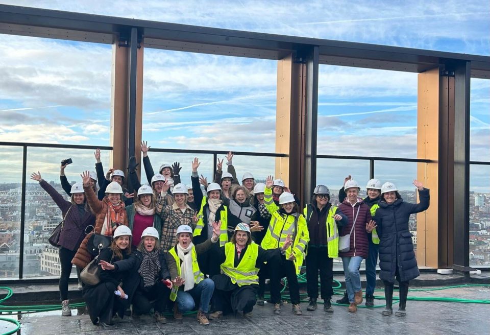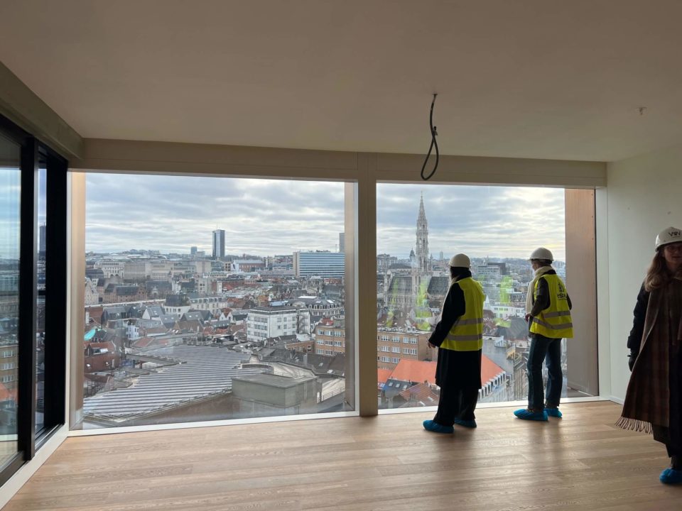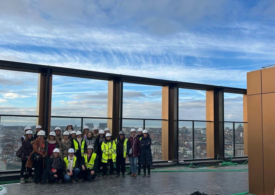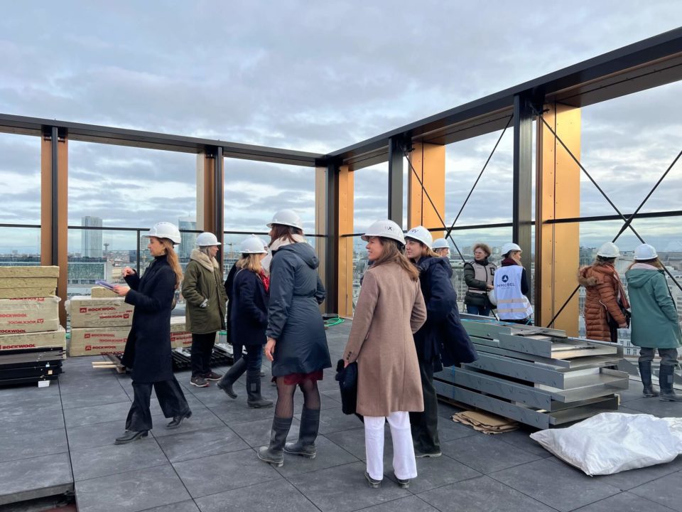 Valérie Vermandel (Whitewood), Lilia Potcheva (DDS+), Loriane Lion et Valérie Van Malleghem (Immobel) nous ont fait la présentation du projet et de ses aspects innovants avant d’effectuer la visite et de parcourir les 17 étages du batiment … à pied.